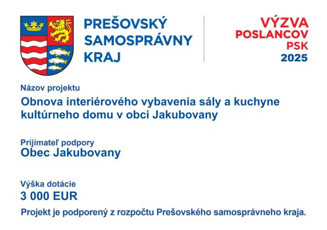 Vďaka projektu "Modernizácia vybavenia obecnej knižnice Jakubovany" a projektu „Nové knihy do knižnice“ sa nakúpil nový nábytok, nové knihy a taktiež sa rozšíril nový priestor o čitateľskú zónu. Obe tieto projekty z verejných zdrojov podporil Fond na podporu umenia . Za pomoc pri realizácii projektu ďakujem Marka Staviarska, Marek Holeša, Paulína Bašistová a za dodanie techniky p. Andrejovi Šoltýsovi. Za kultúrny program ďakujem žiakom ZUŠ.
