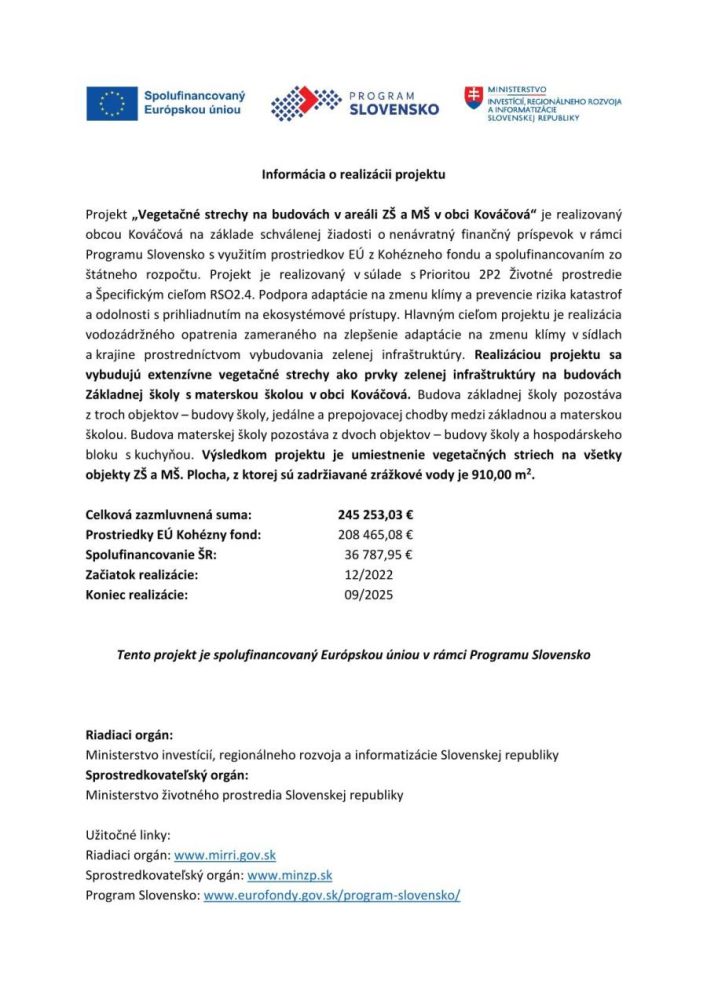 KOVÁČOVÁ: Projekt Vegetačné strechy na budovách v areáli ZŠ a MŠ