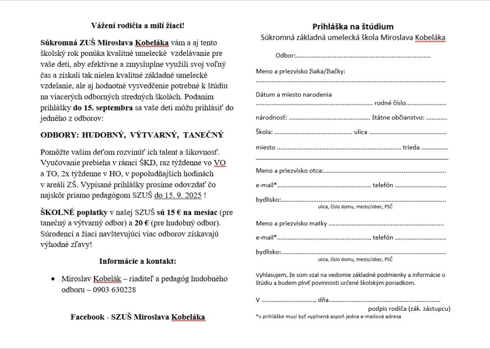Súkromná ZUŠ Miroslava Kobeláka pozýva deti na zápis do umeleckých odborov. Rodičia môžu prihlásiť svoje deti do hudobného, výtvarného alebo tanečného odboru, pričom podanie prihlášky je potrebné do 15. septembra 2025. Školné poplatky sú 15 € na mesiac pre tanečný a výtvarný odbor, a 20 € pre hudobný odbor. Zľavy sú dostupné pre súrodencov a žiakov navštevujúcich viac odborov.