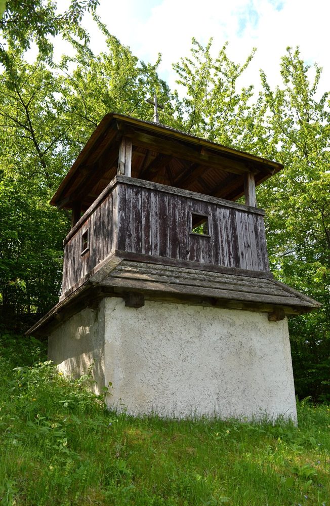 Dedinská zvonica, drevená ľudová stavba na pôdoryse štvorca z druhej polovice 19. storočia.