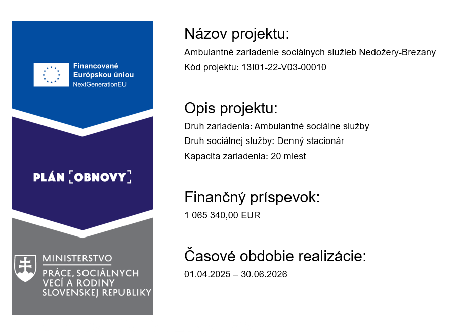 Obec sa v roku 2024 zapojila do výzvy vyhlásenej Ministerstvom práce, sociálnych veci a rodiny. V roku 2025 zrealizujeme ambulatné zariadenie pre 20 klientov. So schváleným projektom bol schválený aj nenávratný finančný príspevok vo výške 1 065 340,00 €.